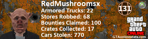[URL=http://GTAonlinestats.com/showplayer/RedMushroomsx][IMG]http://GTAonlinestats.com/crimesignature/RedMushroomsx/sig.png[/IMG][/URL]