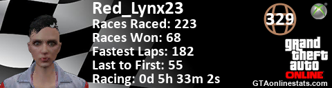 [URL=http://GTAonlinestats.com/showplayer/Red_Lynx23][IMG]http://GTAonlinestats.com/racesignature/Red_Lynx23/sig.png[/IMG][/URL]