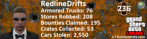 [URL=http://GTAonlinestats.com/showplayer/RedlineDrifts][IMG]http://GTAonlinestats.com/crimesignature/RedlineDrifts/sig.png[/IMG][/URL]