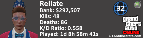 [URL=http://GTAonlinestats.com/showplayer/Rellate][IMG]http://GTAonlinestats.com/greysignature/Rellate/sig.png[/IMG][/URL]