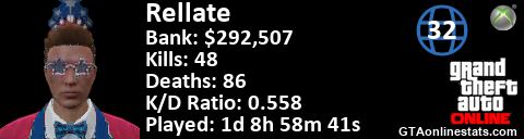 [URL=http://GTAonlinestats.com/showplayer/Rellate][IMG]http://GTAonlinestats.com/signature/Rellate/sig.png[/IMG][/URL]