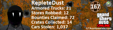 <a href="http://GTAonlinestats.com/showplayer/RepleteDust"><img src="http://GTAonlinestats.com/randomsignature/RepleteDust/sig.png" alt="RepleteDust" border="0" /></a>