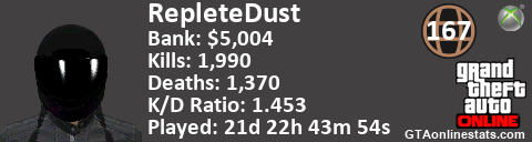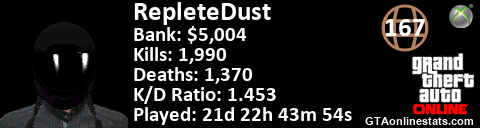 <a href="http://GTAonlinestats.com/showplayer/RepleteDust"><img src="http://GTAonlinestats.com/dmsignature/RepleteDust/sig.png" alt="RepleteDust" border="0" /></a>