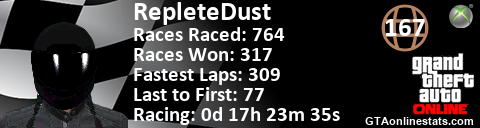 <a href="http://GTAonlinestats.com/showplayer/RepleteDust"><img src="http://GTAonlinestats.com/racesignature/RepleteDust/sig.png" alt="RepleteDust" border="0" /></a>