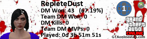[URL=http://GTAonlinestats.com/showplayer/RepleteDust/2][IMG]http://GTAonlinestats.com/dmsignature/RepleteDust/2/sig.png[/IMG][/URL]