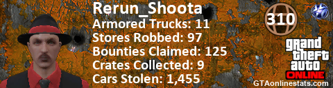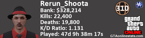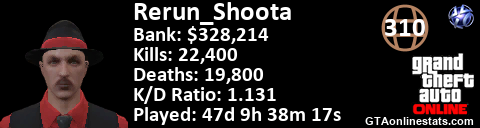 <a href="http://GTAonlinestats.com/showplayer/Rerun_Shoota"><img src="http://GTAonlinestats.com/randomsignature/Rerun_Shoota/sig.png" alt="Rerun_Shoota" border="0" /></a>