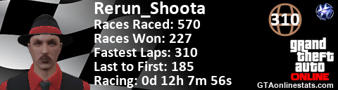 [URL=http://GTAonlinestats.com/showplayer/Rerun_Shoota][IMG]http://GTAonlinestats.com/racesignature/Rerun_Shoota/sig.png[/IMG][/URL]