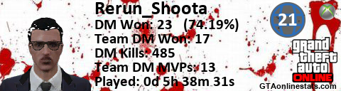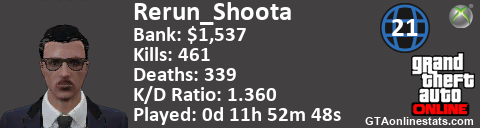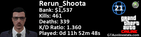 [URL=http://GTAonlinestats.com/showplayer/Rerun_Shoota/2][IMG]http://GTAonlinestats.com/signature/Rerun_Shoota/2/sig.png[/IMG][/URL]