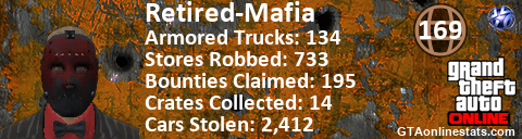 [URL=http://GTAonlinestats.com/showplayer/Retired-Mafia][IMG]http://GTAonlinestats.com/crimesignature/Retired-Mafia/sig.png[/IMG][/URL]