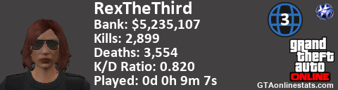 <a href="http://GTAonlinestats.com/showplayer/RexTheThird/3"><img src="http://GTAonlinestats.com/dmsignature/RexTheThird/3/sig.png" alt="RexTheThird" border="0" /></a>