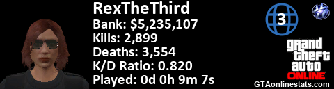 [URL=http://GTAonlinestats.com/showplayer/RexTheThird/3][IMG]http://GTAonlinestats.com/signature/RexTheThird/3/sig.png[/IMG][/URL]
