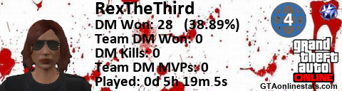 <a href="http://GTAonlinestats.com/showplayer/RexTheThird/5"><img src="http://GTAonlinestats.com/dmsignature/RexTheThird/5/sig.png" alt="RexTheThird" border="0" /></a>