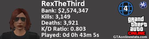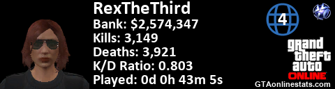 [URL=http://GTAonlinestats.com/showplayer/RexTheThird/5][IMG]http://GTAonlinestats.com/signature/RexTheThird/5/sig.png[/IMG][/URL]