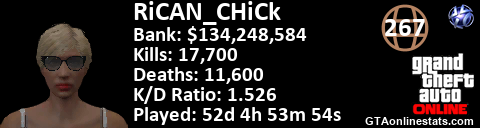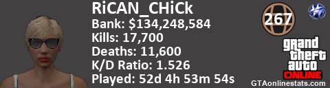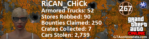 [URL=http://GTAonlinestats.com/showplayer/RiCAN_CHiCk][IMG]http://GTAonlinestats.com/signature/RiCAN_CHiCk/sig.png[/IMG][/URL]