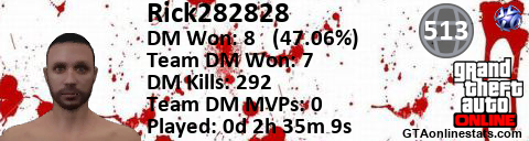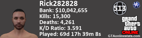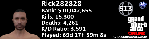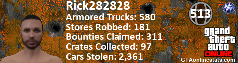 <a href="http://GTAonlinestats.com/showplayer/Rick282828"><img src="http://GTAonlinestats.com/randomsignature/Rick282828/sig.png" alt="Rick282828" border="0" /></a>