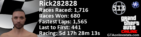 <a href="http://GTAonlinestats.com/showplayer/Rick282828"><img src="http://GTAonlinestats.com/racesignature/Rick282828/sig.png" alt="Rick282828" border="0" /></a>