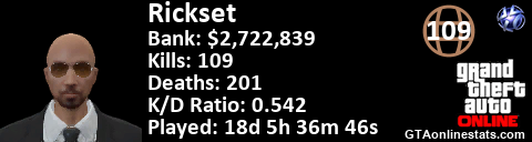 [URL=http://GTAonlinestats.com/showplayer/Rickset/2][IMG]http://GTAonlinestats.com/signature/Rickset/2/sig.png[/IMG][/URL]