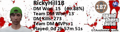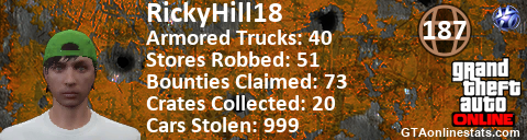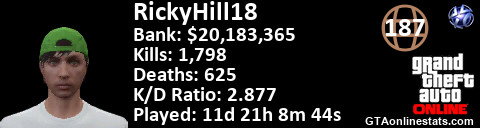 <a href="http://GTAonlinestats.com/showplayer/RickyHill18"><img src="http://GTAonlinestats.com/randomsignature/RickyHill18/sig.png" alt="RickyHill18" border="0" /></a>