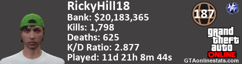 <a href="http://GTAonlinestats.com/showplayer/RickyHill18"><img src="http://GTAonlinestats.com/signature/RickyHill18/sig.png" alt="RickyHill18" border="0" /></a>