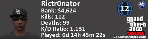 [URL=http://GTAonlinestats.com/showplayer/Rictr0nator][IMG]http://GTAonlinestats.com/signature/Rictr0nator/sig.png[/IMG][/URL]