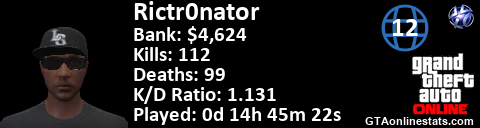[URL=http://GTAonlinestats.com/showplayer/Rictr0nator][IMG]http://GTAonlinestats.com/dmsignature/Rictr0nator/sig.png[/IMG][/URL]