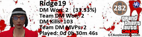 [URL=http://GTAonlinestats.com/showplayer/Ridge19/2][IMG]http://GTAonlinestats.com/dmsignature/Ridge19/2/sig.png[/IMG][/URL]