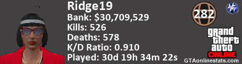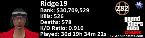 [URL=http://GTAonlinestats.com/showplayer/Ridge19/2][IMG]http://GTAonlinestats.com/signature/Ridge19/2/sig.png[/IMG][/URL]