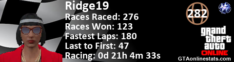 [URL=http://GTAonlinestats.com/showplayer/Ridge19/2][IMG]http://GTAonlinestats.com/racesignature/Ridge19/2/sig.png[/IMG][/URL]