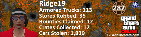 [URL=http://GTAonlinestats.com/showplayer/Ridge19/2][IMG]http://GTAonlinestats.com/crimesignature/Ridge19/2/sig.png[/IMG][/URL]