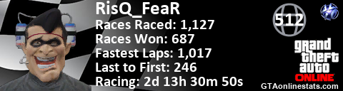 <a href="http://GTAonlinestats.com/showplayer/RisQ_FeaR"><img src="http://GTAonlinestats.com/racesignature/RisQ_FeaR/sig.png" alt="RisQ_FeaR" border="0" /></a>