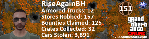 [URL=http://GTAonlinestats.com/showplayer/RiseAgainBH][IMG]http://GTAonlinestats.com/crimesignature/RiseAgainBH/sig.png[/IMG][/URL]