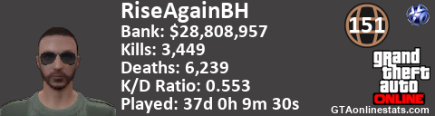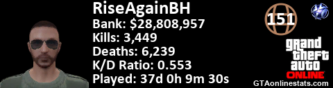 <a href="http://GTAonlinestats.com/showplayer/RiseAgainBH"><img src="http://GTAonlinestats.com/signature/RiseAgainBH/sig.png" alt="RiseAgainBH" border="0" /></a>