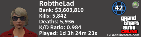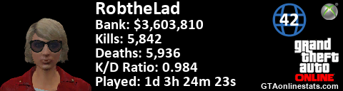 <a href="http://GTAonlinestats.com/showplayer/RobtheLad/3"><img src="http://GTAonlinestats.com/signature/RobtheLad/3/sig.png" alt="RobtheLad" border="0" /></a>