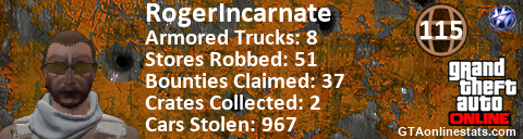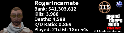 [URL=http://GTAonlinestats.com/showplayer/RogerIncarnate][IMG]http://GTAonlinestats.com/signature/RogerIncarnate/sig.png[/IMG][/URL]