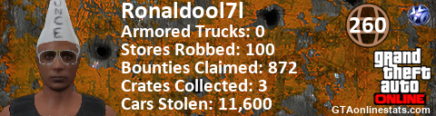 [URL=http://GTAonlinestats.com/showplayer/Ronaldool7l][IMG]http://GTAonlinestats.com/crimesignature/Ronaldool7l/sig.png[/IMG][/URL]
