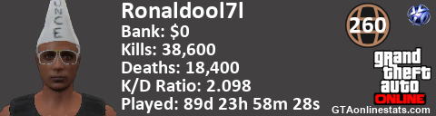 <a href="http://GTAonlinestats.com/showplayer/Ronaldool7l"><img src="http://GTAonlinestats.com/signature/Ronaldool7l/sig.png" alt="Ronaldool7l" border="0" /></a>