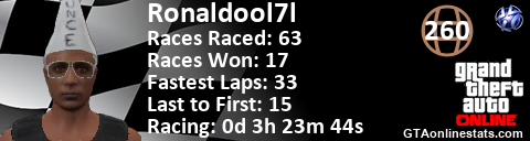 <a href="http://GTAonlinestats.com/showplayer/Ronaldool7l"><img src="http://GTAonlinestats.com/racesignature/Ronaldool7l/sig.png" alt="Ronaldool7l" border="0" /></a>