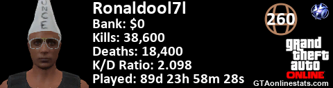 [URL=http://GTAonlinestats.com/showplayer/Ronaldool7l][IMG]http://GTAonlinestats.com/signature/Ronaldool7l/sig.png[/IMG][/URL]