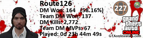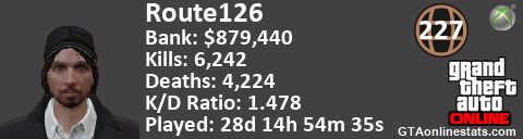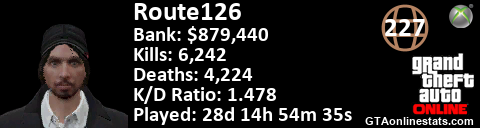 [URL=http://GTAonlinestats.com/showplayer/Route126][IMG]http://GTAonlinestats.com/dmsignature/Route126/sig.png[/IMG][/URL]