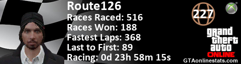 <a href="http://GTAonlinestats.com/showplayer/Route126"><img src="http://GTAonlinestats.com/racesignature/Route126/sig.png" alt="Route126" border="0" /></a>