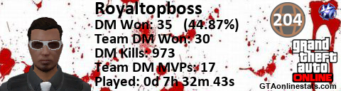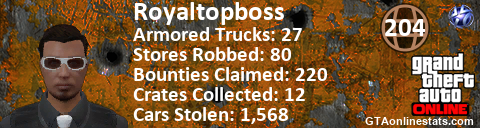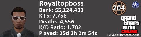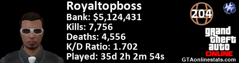 <a href="http://GTAonlinestats.com/showplayer/Royaltopboss"><img src="http://GTAonlinestats.com/randomsignature/Royaltopboss/sig.png" alt="Royaltopboss" border="0" /></a>