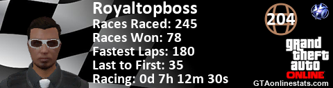 <a href="http://GTAonlinestats.com/showplayer/Royaltopboss"><img src="http://GTAonlinestats.com/racesignature/Royaltopboss/sig.png" alt="Royaltopboss" border="0" /></a>