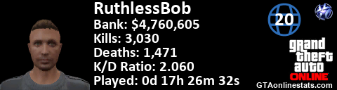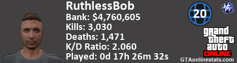 [URL=http://GTAonlinestats.com/showplayer/RuthlessBob/3][IMG]http://GTAonlinestats.com/signature/RuthlessBob/3/sig.png[/IMG][/URL]