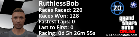 <a href="http://GTAonlinestats.com/showplayer/RuthlessBob/3"><img src="http://GTAonlinestats.com/racesignature/RuthlessBob/3/sig.png" alt="RuthlessBob" border="0" /></a>