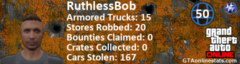 [URL=http://GTAonlinestats.com/showplayer/RuthlessBob/4][IMG]http://GTAonlinestats.com/crimesignature/RuthlessBob/4/sig.png[/IMG][/URL]
