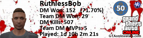 [URL=http://GTAonlinestats.com/showplayer/RuthlessBob/4][IMG]http://GTAonlinestats.com/dmsignature/RuthlessBob/4/sig.png[/IMG][/URL]