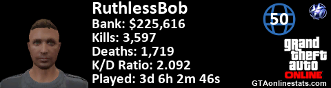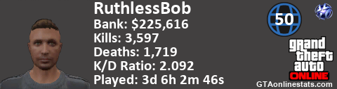 [URL=http://GTAonlinestats.com/showplayer/RuthlessBob/4][IMG]http://GTAonlinestats.com/signature/RuthlessBob/4/sig.png[/IMG][/URL]
