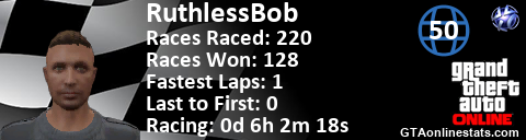 <a href="http://GTAonlinestats.com/showplayer/RuthlessBob/4"><img src="http://GTAonlinestats.com/racesignature/RuthlessBob/4/sig.png" alt="RuthlessBob" border="0" /></a>