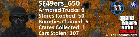 [URL=http://GTAonlinestats.com/showplayer/SF49ers_650][IMG]http://GTAonlinestats.com/crimesignature/SF49ers_650/sig.png[/IMG][/URL]