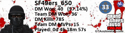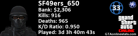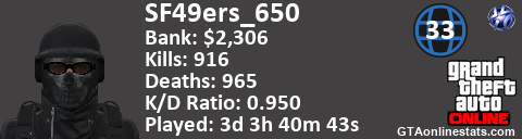 [URL=http://GTAonlinestats.com/showplayer/SF49ers_650][IMG]http://GTAonlinestats.com/signature/SF49ers_650/sig.png[/IMG][/URL]